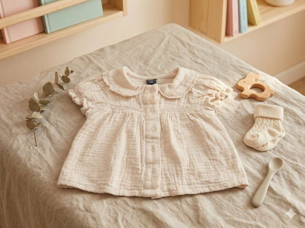Voici ses caractéristiques principales :Matière Noble : Confectionnée en double gaze de coton beige, elle offre une texture gaufrée, légère et très respirante, idéale pour le confort de bébé. Style Rétro et Romantique : Un large col Claudine bordé de dentelle délicate. Un empiècement au crochet ajouré sur la poitrine qui souligne la coupe évasée. De petites manches ballons élastiquées pour une silhouette adorable. Finitions Pratiques : Elle se ferme sur toute la longueur à l'aide de petits boutons transparents assortis, facilitant l'habillage. Coloris Intemporel : Son ton écru/beige naturel en fait une pièce facile à assortir avec un petit béguin ou des chaussons en maille, comme suggéré dans la présentation.
