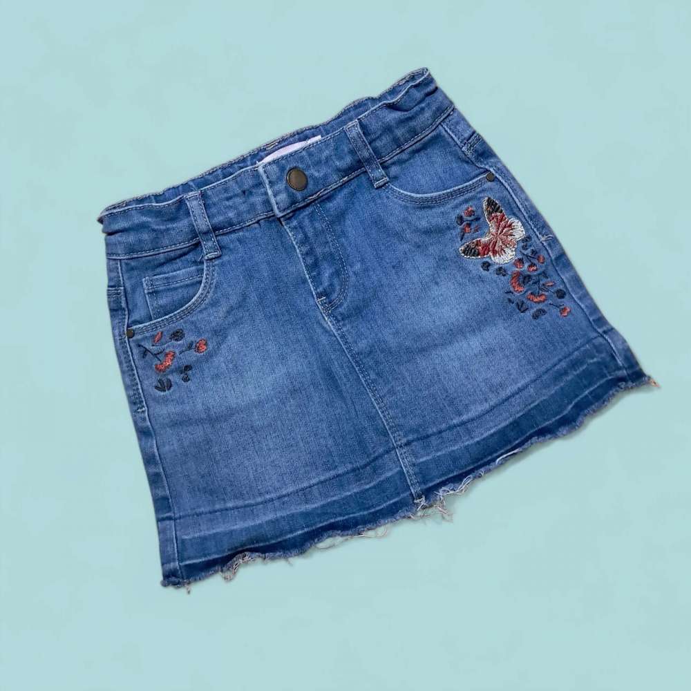 "Jolie jupe en jean taille 5 ans, tendance et confortable, avec ses broderies papillon délicates pour une touche de fantaisie – parfaite pour un look estival plein de fraîcheurs