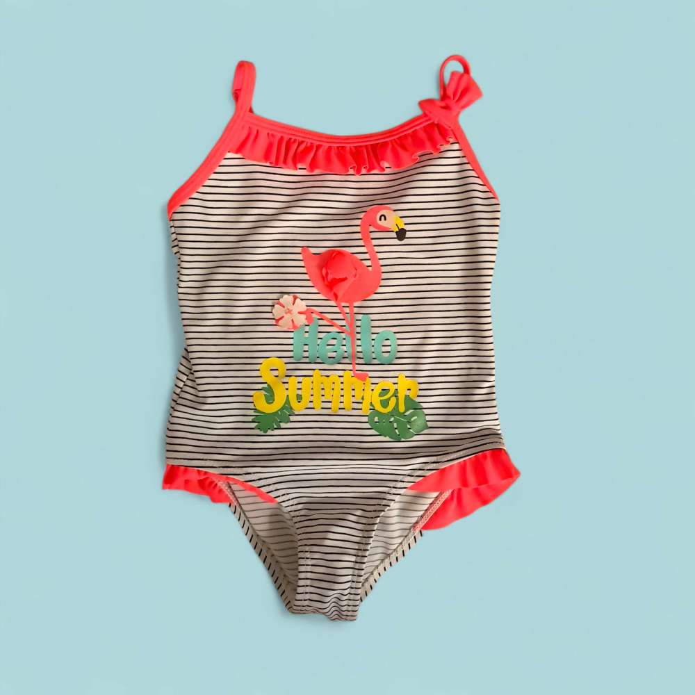 "Craquez pour ce maillot de bain trop mignon avec son flamant rose et son message 'Hello Summer' – parfait pour des vacances ensoleillées et pleines de style