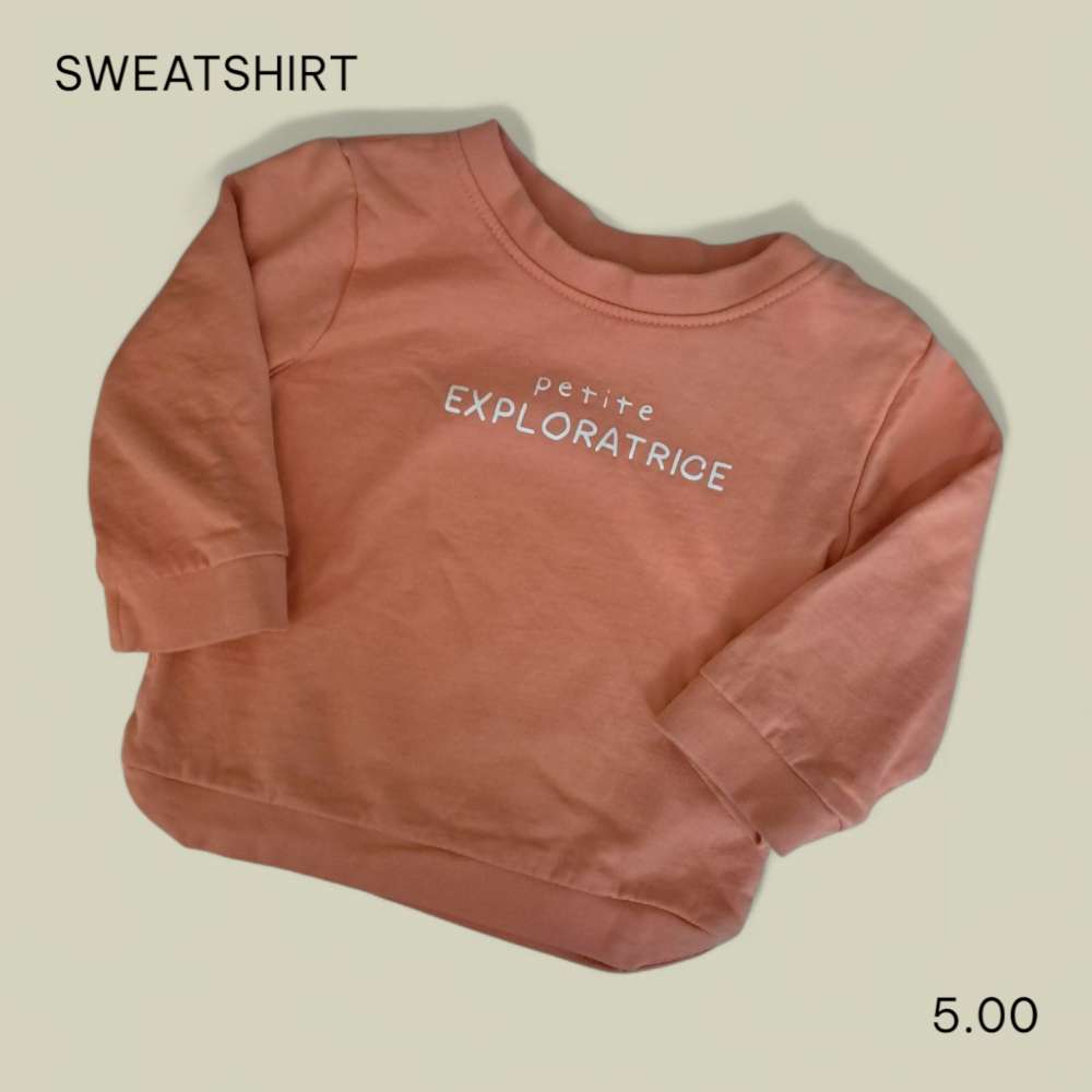 SWEAT-SHIRT Etat : excellent € 5.00 Sexe : FilleTaille : 86 Age : 18 moisCouleur : Camel Matière : coton Marque : KIABI Article unique, quantité = 1Ajouter au panierRetour page précédente